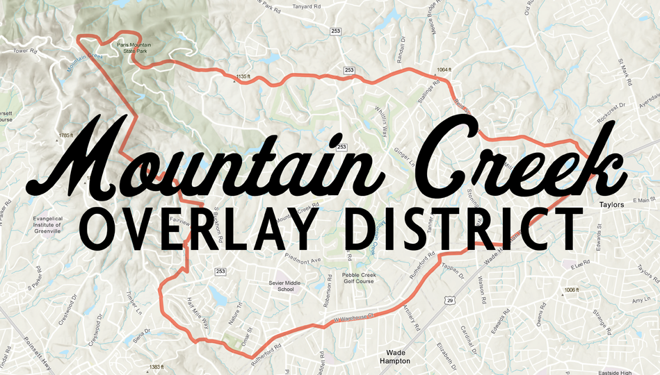Greenville County Long Range Planning, in collaboration with Mountain Creek community members, will host a community meeting in support of a proposed Mountain Creek Community Overlay District. This meeting will take place on Monday, March 30 from 6:00 p.m. to 7:30 p.m. at Taylors Ministry Center, 1 W. Main St., Taylors.